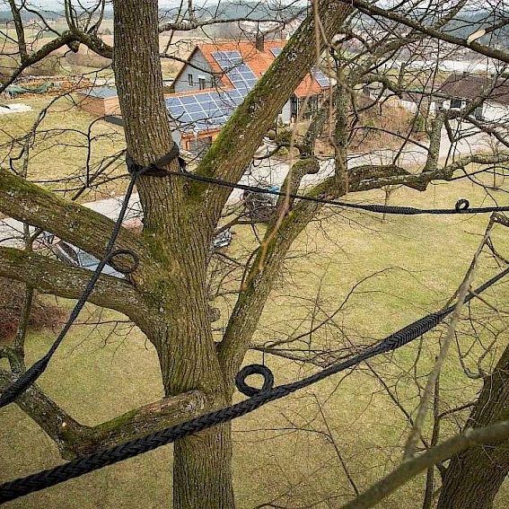 Um die Stabilität von Bäumen langfristig zu erhalten, bieten wir die fachgerechte Montage von Kronensicherungen an. Diese flexible Seiltechnik verbindet einzelne Äste oder Stämmlinge miteinander und vermindert so die Bruchgefahr. Auf diese Weise bleibt der Baum vital, seine natürliche Form wird erhalten und gleichzeitig wird die Sicherheit im Umfeld gewährleistet.