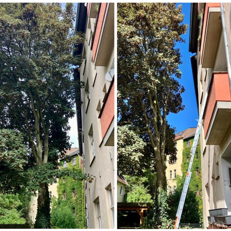Um die Hausfassade unserer Kunden zu schützen, haben wir den Ahorn sorgfältig zurückgeschnitten. So verhindern wir, dass die Äste den Putz verkratzen und ermöglichen zugleich eine bessere Luftzirkulation. Dadurch kann Feuchtigkeit schneller verdunsten und die Fassade bleibt dauerhaft schön und intakt.