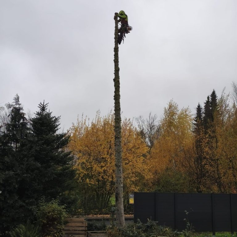 Der Baum stellte besondere Anforderungen an unsere Arbeit: Die enge Lage zwischen Straße, Hecke und Zaun machte eine stückweise Abtragung notwendig, um die darunterliegenden Strukturen zu schützen und die Sicherheit während der Fällarbeiten zu gewährleisten. Mit fachgerechter Planung und professioneller Seil- und Klettertechnik konnten wir die Stechfichte sicher und effizient entfernen.