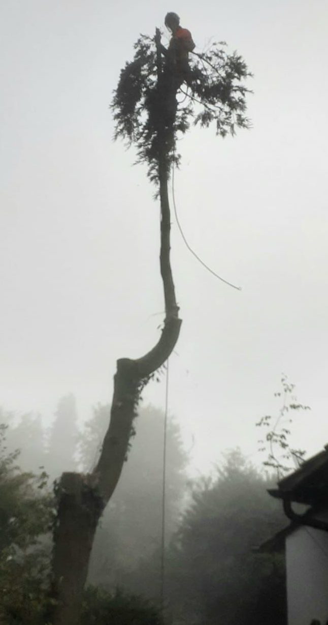 Diese Hemlocktanne war über viele Jahre unkontrolliert gewachsen und hatte bereits ein komplettes Hausdach überwachsen. Um Schäden an Gebäude und Dach zu vermeiden, wurde der Baum kontrolliert und Stück für Stück mithilfe von Seiltechnik abgetragen. So konnte die Fällung sicher und präzise durchgeführt werden, ohne die Bausubstanz zu gefährden.