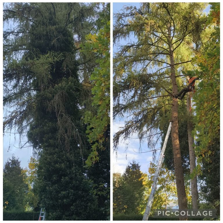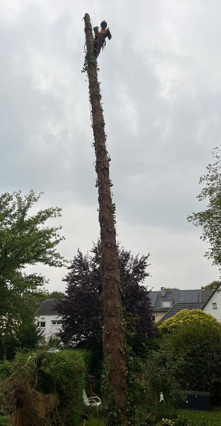 Bei einem aktuellen Projekt haben wir drei rund 20 Meter hohe, vollständig in Efeu eingewachsene Lärchen restauriert. Durch die behutsame Entfernung des Bewuchses und gezielte Pflegemaßnahmen konnten wir die Vitalität der Bäume langfristig sichern. Zusätzlich haben wir alle Eichen auf dem Grundstück gepflegt, um ihre Stabilität und Gesundheit zu fördern. Ein schönes Beispiel dafür, wie fachgerechte Baumpflege die natürliche Schönheit und Lebensdauer alter Bäume erhält.